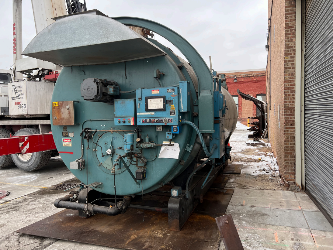 Inventory Cleaver Brooks 200-600-200-1973 Model: 600HP Cleaver Brooks/Scotch Marine Boiler.pdf BOILER Manufacturer: CLEAVER BROOKSModel: CB-200-600-200Year: 1973Type: SteamCapacity: 600 HPPressure: 200 PSIBurner: Low NOx NG CONNECTIONS Steam Inlet: 8″Natural Gas: 4″Feedwater 2 1/2″Bottom Blowdown: 1″Continuous Blowdown: 2″ EMMISIONS NOx: 60 PPMVOC: N/ACO: 200 PPMPM: N/A ELECTRICAL 460V/3PH/60HZ FUEL CONSUMPTION Natural Gas: 24,199 SCFH ADDITIONAL INFORMATION Scotch Marine Boiler DIMENSIONS L x W x H: 278″ x 116″ x 88″Shipping Weight: 33,429 LBSOperating Weight: 53,627 LBS